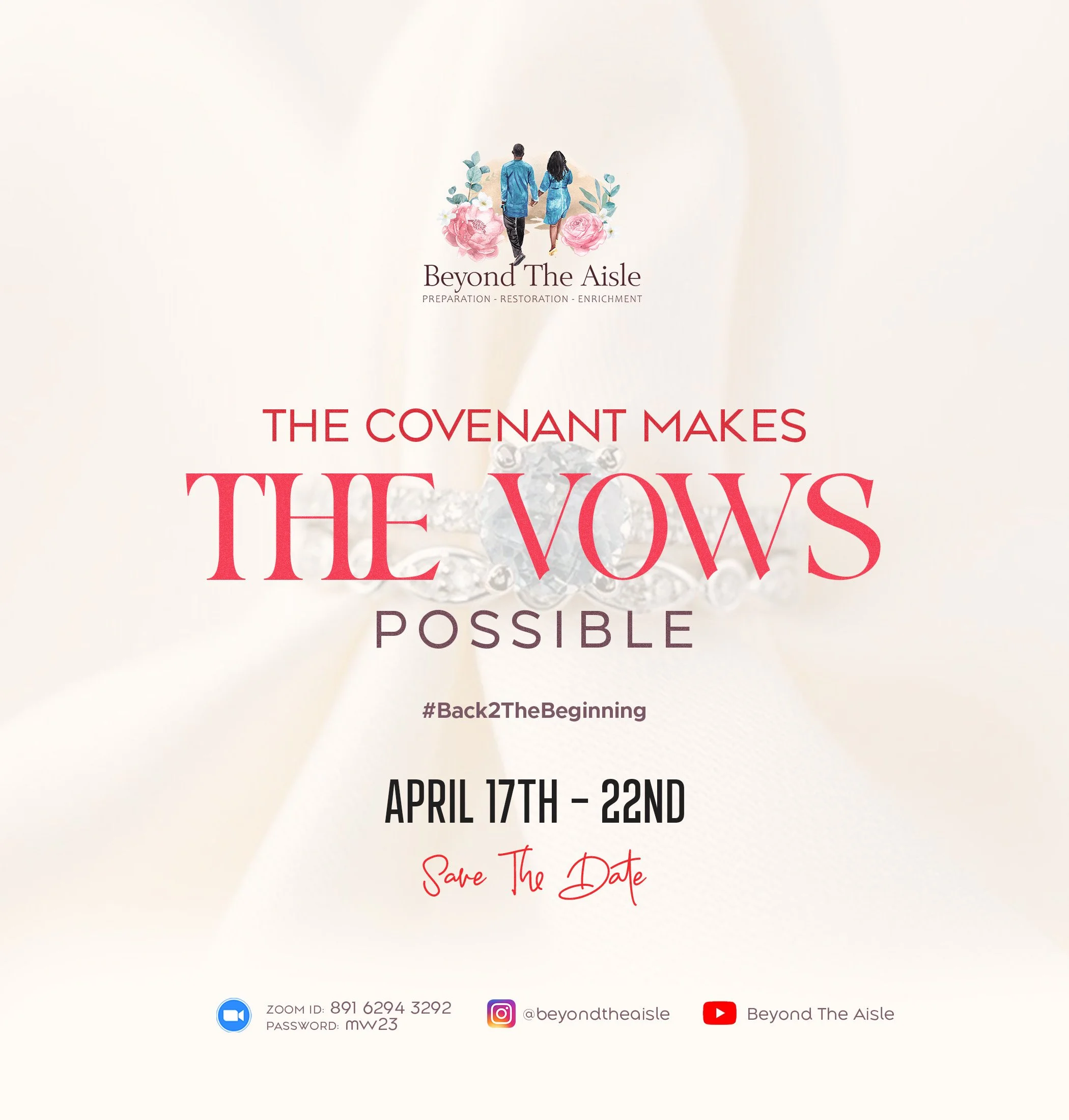 Join us virtually from April 17th to 21st at 7:30 pm EST each night, with an in-person gathering in Lorton, Virginia, on April 22nd starting at 5:00 pm. Our six-day conference will feature engaging discussions on various topics on the marriage covenant, challenges faced in upholding it, and strategies for building a solid foundation for a lifelong marriage.